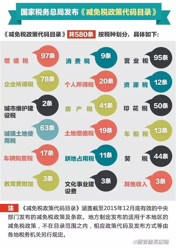 新版《減免稅政策代碼目錄》(以下簡稱《代碼目錄》)包括580條,涉及增值稅、消費稅、營業稅、企業所得稅、個人所得稅、資源稅、房產稅、城市維護建設稅、印花稅、契稅、城鎮土地使用稅、土地增值稅、車船稅、車輛購置稅、耕地占用稅、教育費附加和文化事業建設費等。